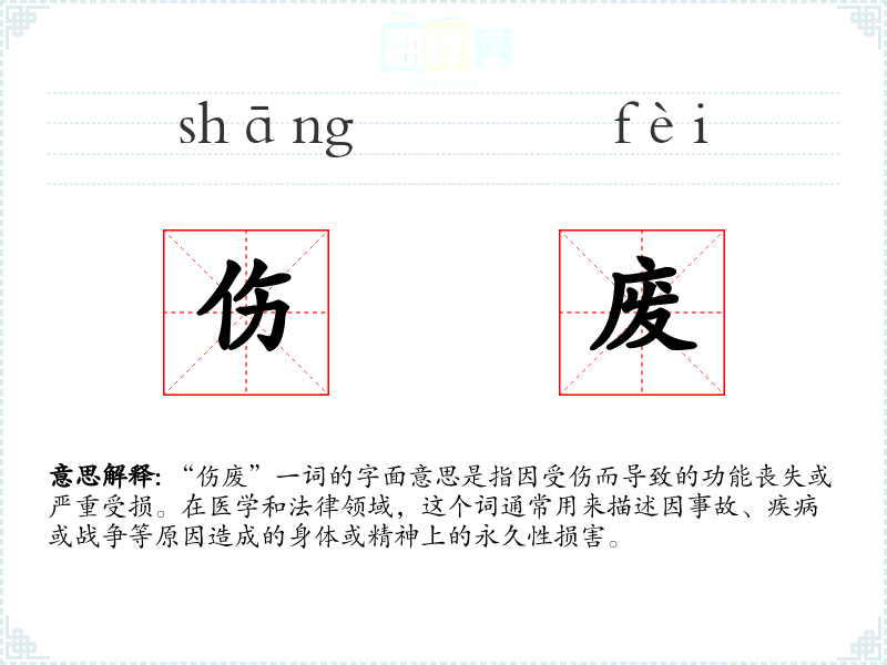 “伤废”一词由“伤”和“废”两个字组成。在古代汉语中,“伤”指身体受到的伤害,“废”则指功能丧失。随着时间的推移,这两个字结合在一起,形成了描述因伤害导致功能丧失的复合词。