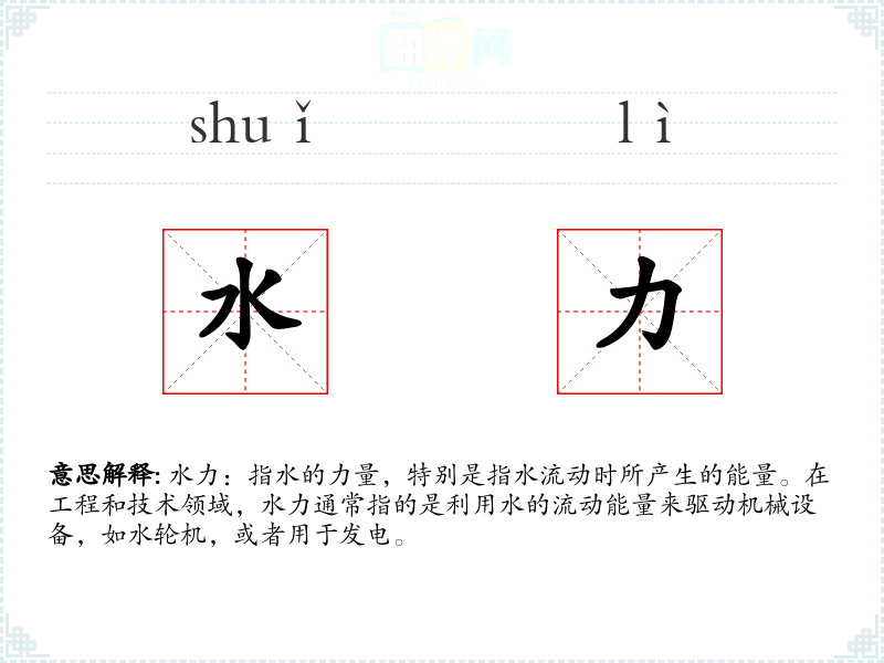 - 反义词:无(水力是一个特定的能量形式,没有直接的反义词)