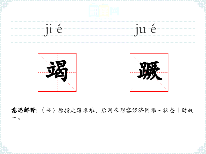 〈书〉原指走路艰难,后用来形容经济困难~状态ㄧ财政~。