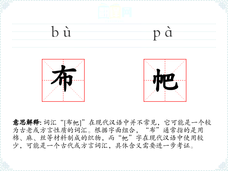 词汇“[布帊]”在现代汉语中并不常见,它可能是一个较为古老或方言性质的词汇。根据字面组合,“布”通常指的是用棉、麻、丝等材料制成的织物,而“帊”字在现代汉语中使用较少,可能是一个古代或方言词汇,具体含义需要进一步考证。