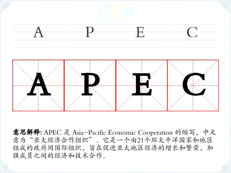 APEC 是 Asia-Pacific Economic Cooperation 的缩写,中文意为“亚太经济合作组织”。它是一个由21个环太平洋国家和地区组成的政府间国际组织,旨在促进亚太地区经济的增长和繁荣,加强成员之间的经济和技术合作。