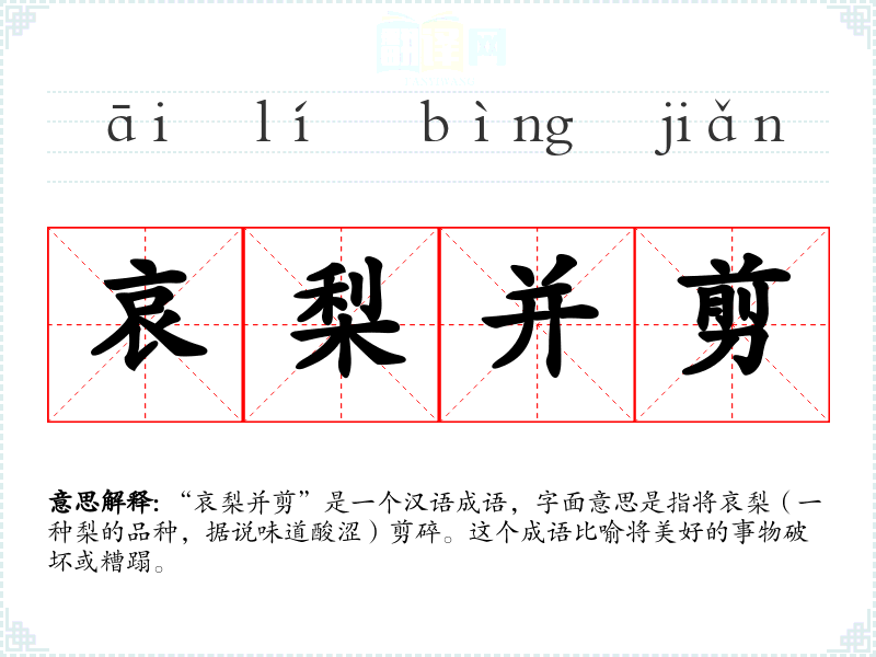 “哀梨并剪”是一个汉语成语,字面意思是指将哀梨(一种梨的品种,据说味道酸涩)剪碎。这个成语比喻将美好的事物破坏或糟蹋。