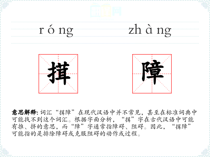 词汇“搑障”在现代汉语中并不常见,甚至在标准词典中可能找不到这个词汇。根据字面分析,“搑”字在古代汉语中可能有推、挤的意思,而“障”字通常指障碍、阻碍。因此,“搑障”可能指的是排除障碍或克服阻碍的动作或过程。