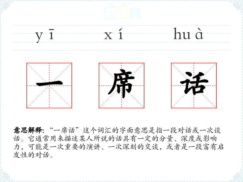“一席话”这个词汇的字面意思是指一段对话或一次谈话。它通常用来描述某人所说的话具有一定的分量、深度或影响力,可能是一次重要的演讲、一次深刻的交谈,或者是一段富有启发性的对话。