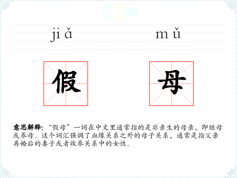 “假母”一词在中文里通常指的是非亲生的母亲,即继母或养母。这个词汇强调了血缘关系之外的母子关系,通常是指父亲再婚后的妻子或者收养关系中的女性。