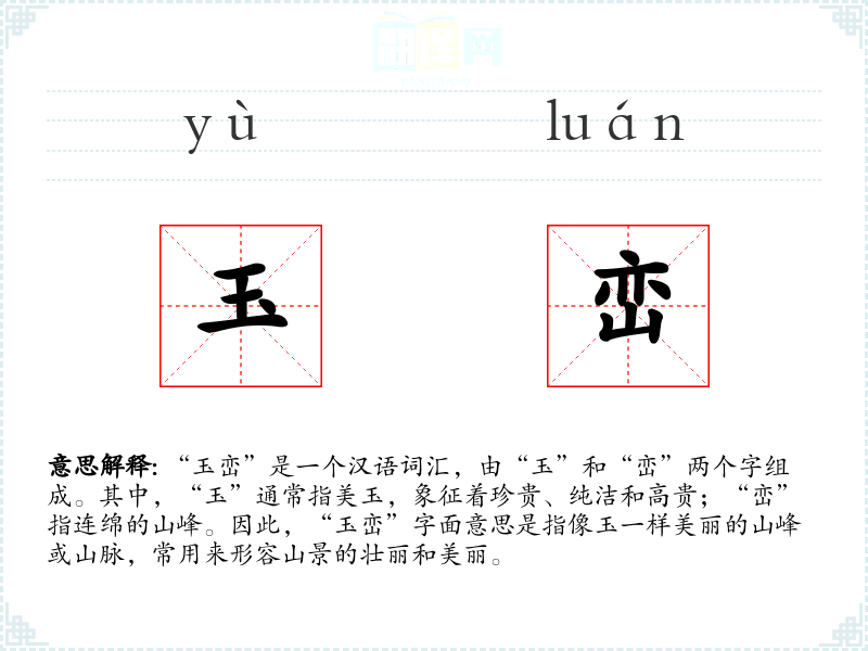 “玉峦”是一个汉语词汇,由“玉”和“峦”两个字组成。其中,“玉”通常指美玉,象征着珍贵、纯洁和高贵;“峦”指连绵的山峰。因此,“玉峦”字面意思是指像玉一样美丽的山峰或山脉,常用来形容山景的壮丽和美丽。