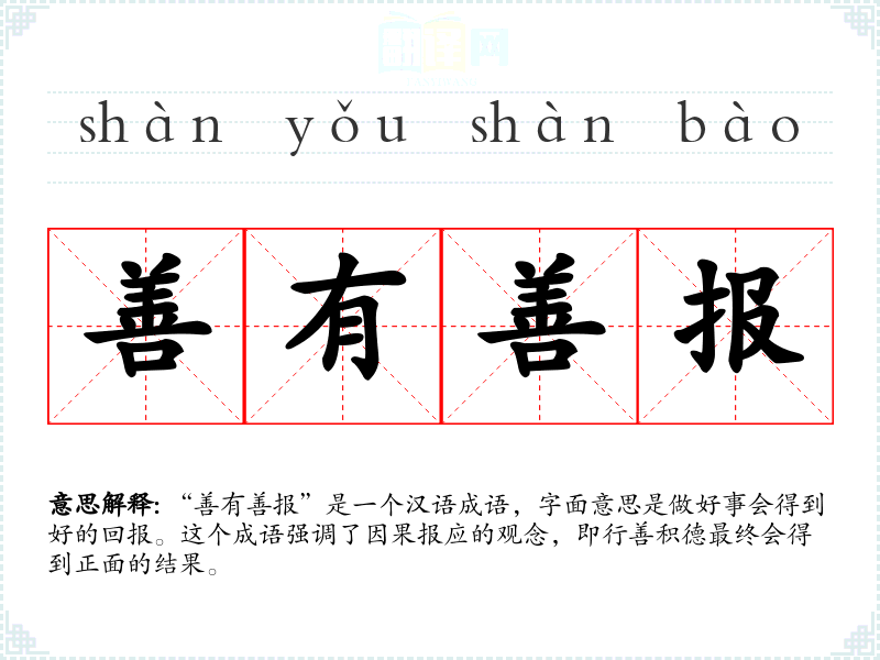 “善有善报”是一个汉语成语,字面意思是做好事会得到好的回报。这个成语强调了因果报应的观念,即行善积德最终会得到正面的结果。
