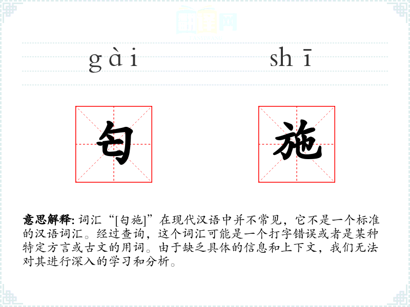 词汇“[匄施]”在现代汉语中并不常见,它不是一个标准的汉语词汇。经过查询,这个词汇可能是一个打字错误或者是某种特定方言或古文的用词。由于缺乏具体的信息和上下文,我们无法对其进行深入的学习和分析。