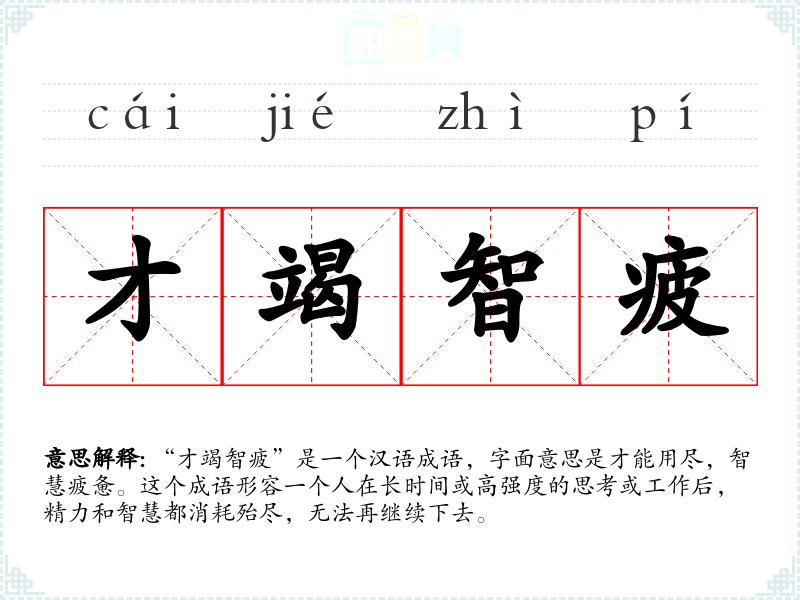 “才竭智疲”是一个汉语成语,字面意思是才能用尽,智慧疲惫。这个成语形容一个人在长时间或高强度的思考或工作后,精力和智慧都消耗殆尽,无法再继续下去。