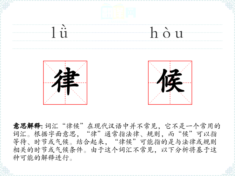 - 反义词:无(由于“律候”不常见,反义词难以确定)