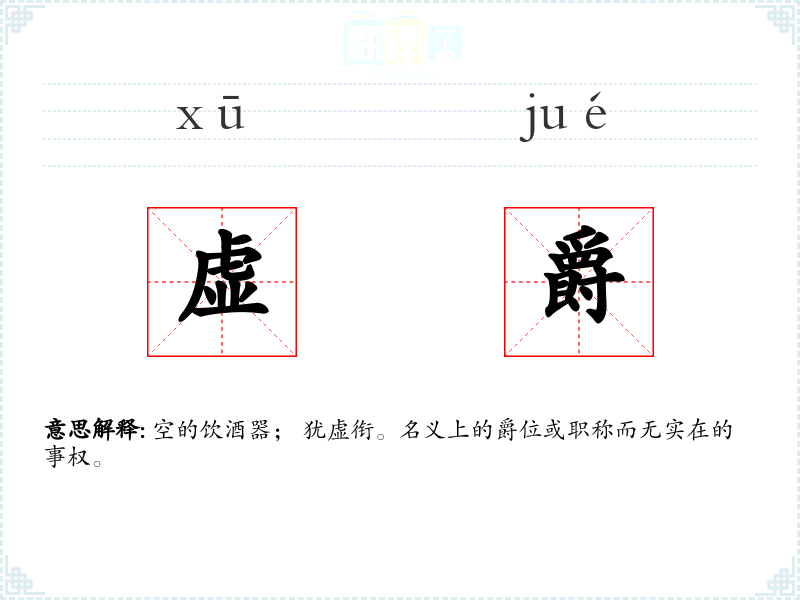 空的饮酒器; 犹虚衔。名义上的爵位或职称而无实在的事权。