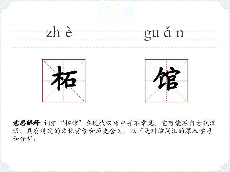 词汇“柘馆”在现代汉语中并不常见,它可能源自古代汉语,具有特定的文化背景和历史含义。以下是对该词汇的深入学*和分析: