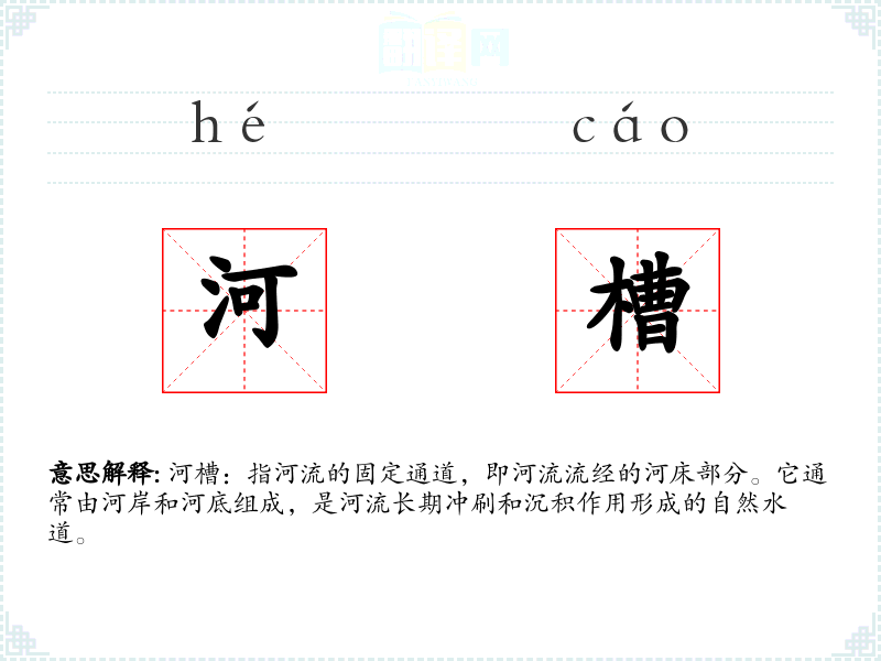 - 专业领域:在水利工程或地理学中,河槽是指河流的物理结构,涉及河流的稳定性、流量和泥沙**等专业知识。