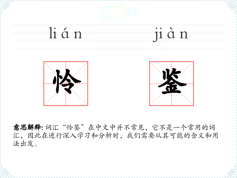 词汇“怜鉴”在中文中并不常见,它不是一个常用的词汇,因此在进行深入学习和分析时,我们需要从其可能的含义和用法出发。