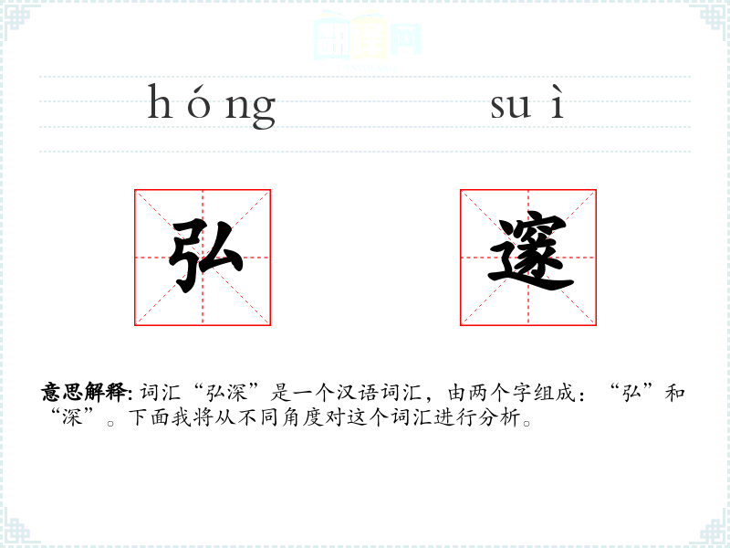 词汇“弘深”是一个汉语词汇,由两个字组成:“弘”和“深”。下面我将从不同角度对这个词汇进行分析。