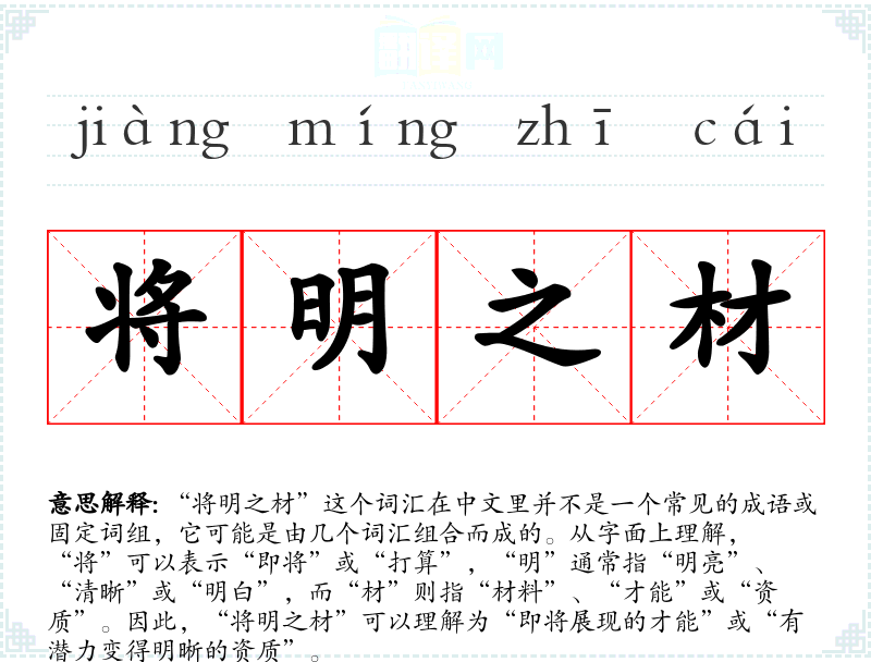 “将明之材”这个词汇虽然不是一个常用词汇,但它提供了一个积极的视角来看待潜在的能力和未来的可能性。在语言学习和表达中,它提醒我们要关注和培养那些尚未完全展现的才能和资质。