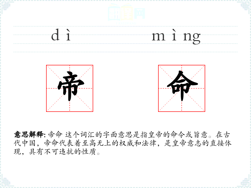 - 反义词:民意、众愿(这些词汇代表了与帝命相对的民间意志或集体愿望)