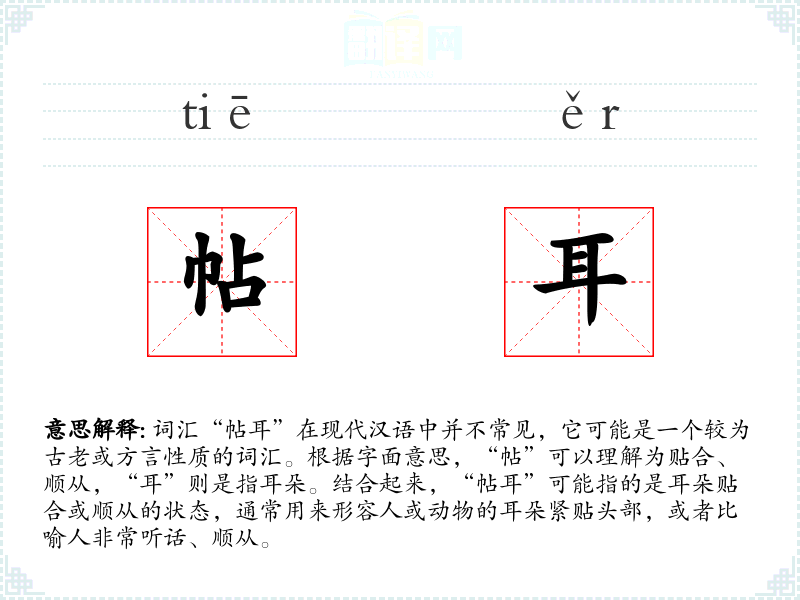 词汇“帖耳”在现代汉语中并不常见,它可能是一个较为古老或方言性质的词汇。根据字面意思,“帖”可以理解为贴合、顺从,“耳”则是指耳朵。结合起来,“帖耳”可能指的是耳朵贴合或顺从的状态,通常用来形容人或动物的耳朵紧贴头部,或者比喻人非常听话、顺从。