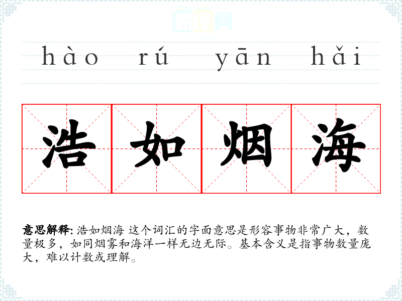 浩如烟海 这个词汇的字面意思是形容事物非常广大,数量极多,如同烟雾和海洋一样无边无际。基本含义是指事物数量庞大,难以计数或理解。