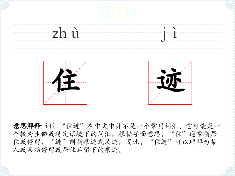 - “住迹”这个词汇可能是由“住”和“迹”两个字组合而成,没有特别复杂的词源或历史演变。
