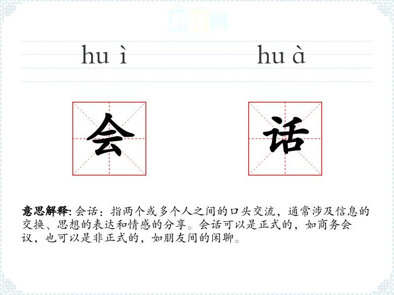 会话:指两个或多个人之间的口头交流,通常涉及信息的交换、思想的表达和情感的分享。会话可以是正式的,如商务会议,也可以是非正式的,如朋友间的闲聊。