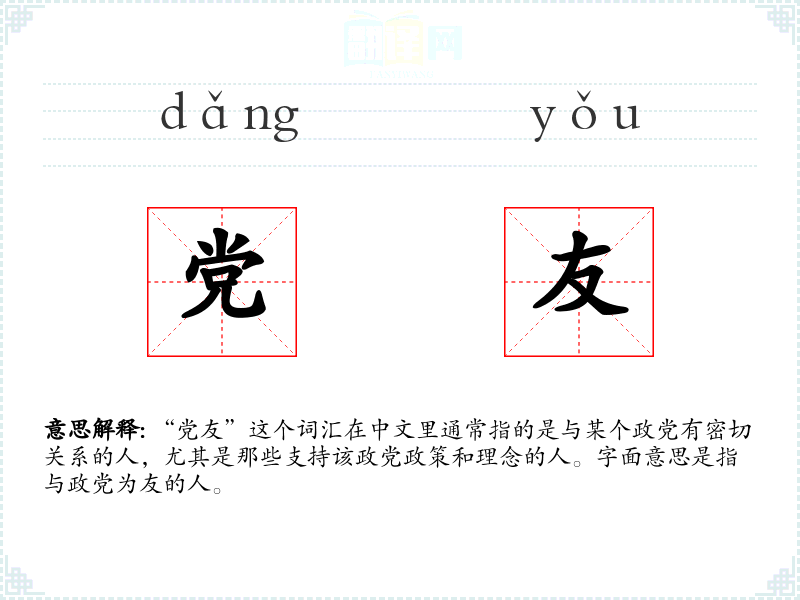 “党友”这个词汇在中文里通常指的是与某个政党有密切关系的人,尤其是那些支持该政党政策和理念的人。字面意思是指与政党为友的人。