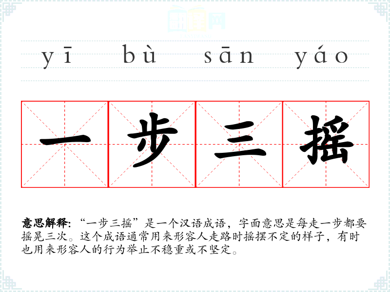 “一步三摇”是一个汉语成语,字面意思是每走一步都要摇晃三次。这个成语通常用来形容人走路时摇摆不定的样子,有时也用来形容人的行为举止不稳重或不坚定。