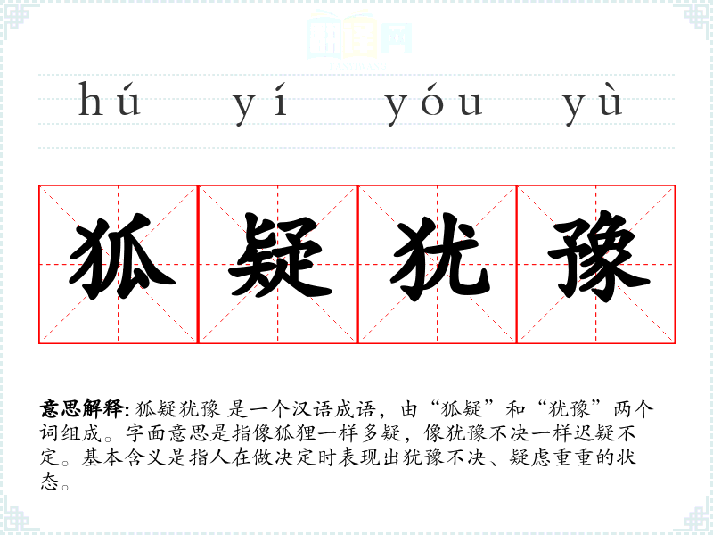 狐疑犹豫 是一个汉语成语,由“狐疑”和“犹豫”两个词组成。字面意思是指像狐狸一样多疑,像犹豫不决一样迟疑不定。基本含义是指人在做决定时表现出犹豫不决、疑虑重重的状态。
