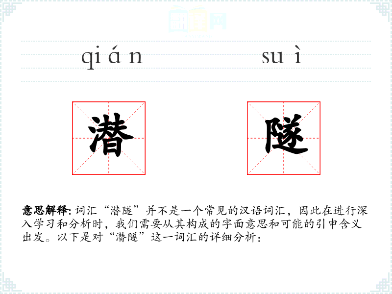 词汇“潜隧”并不是一个常见的汉语词汇,因此在进行深入学*和分析时,我们需要从其构成的字面意思和可能的引申含义出发。以下是对“潜隧”这一词汇的详细分析: