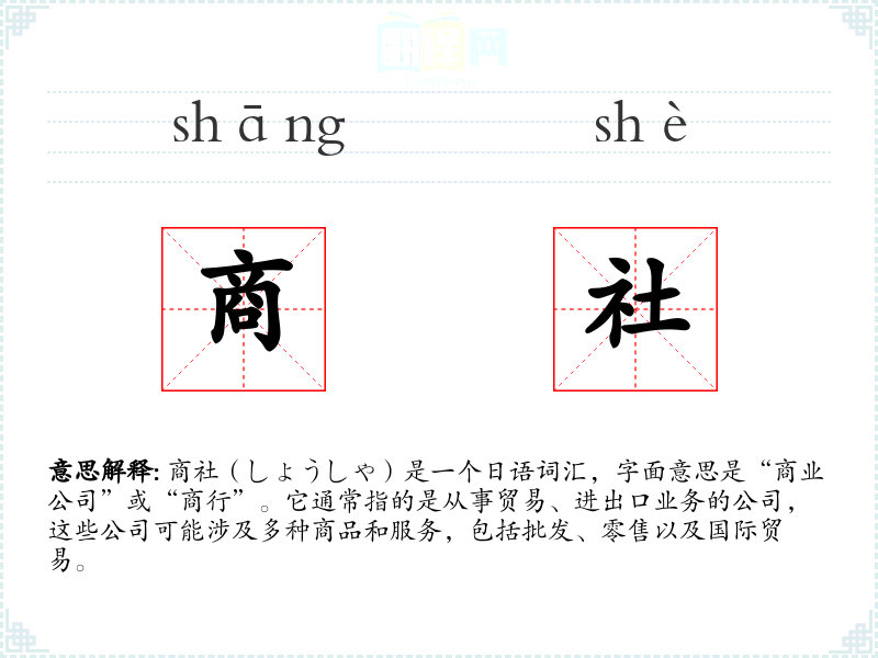 在英语中,“商社”可以对应为“trading company”或“merchant firm”,虽然在不同文化中具体业务可能有所不同,但核心概念相似。