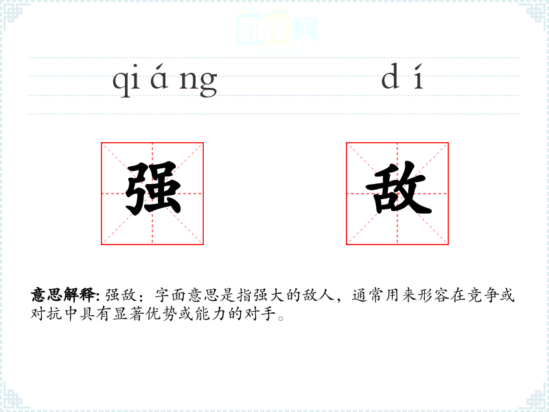强敌:字面意思是指强大的敌人,通常用来形容在竞争或对抗中具有显著优势或能力的对手。