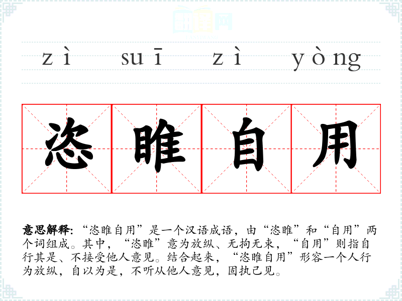 “恣睢”一词最早见于《左传》等古代文献,原指放纵无度。“自用”则是一个较为常见的词汇,意指自行其是。这两个词组合成“恣睢自用”后,其含义更加具体,专指那种极端的自我中心行为。