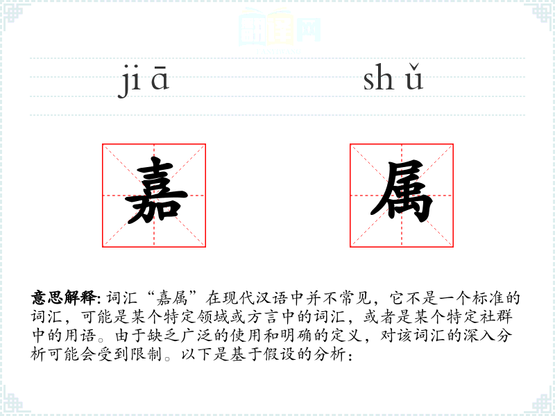 由于“嘉属”不是一个标准词汇,它在不同语境下的使用可能非常有限。在某些特定的文学作品或方言中,它可能被用来形容某个群体或事物的优秀特质。