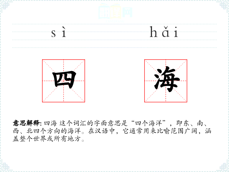 四海 这个词汇的字面意思是“四个海洋”,即东、南、西、北四个方向的海洋。在汉语中,它通常用来比喻范围广阔,涵盖整个世界或所有地方。