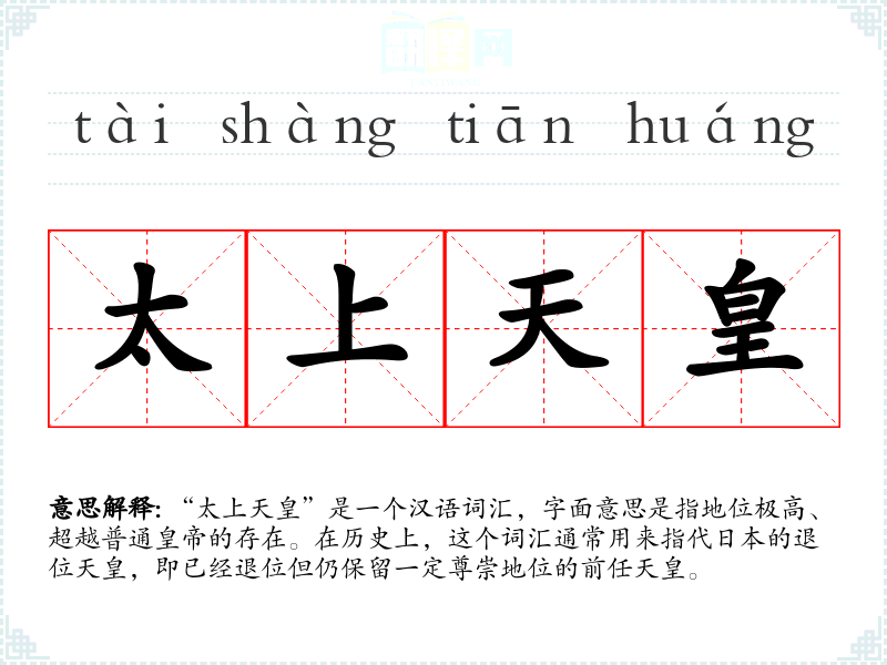 “太上天皇”是一个汉语词汇,字面意思是指地位极高、超越普通**的存在。在历史上,这个词汇通常用来指代日本的退位天皇,即已经退位但仍保留一定尊崇地位的前任天皇。