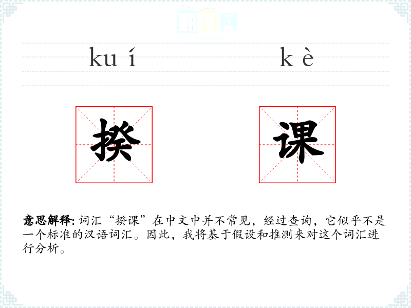词汇“揆课”在中文中并不常见,经过查询,它似乎不是一个标准的汉语词汇。因此,我将基于假设和推测来对这个词汇进行分析。