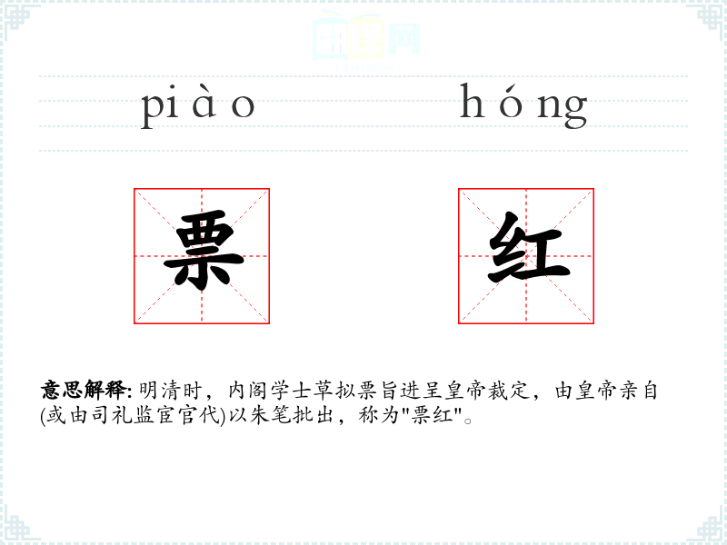 明清时,内阁学士草拟票旨进呈皇帝裁定,由皇帝亲自(或由司礼监宦官代)以朱笔批出,称为"票红"。