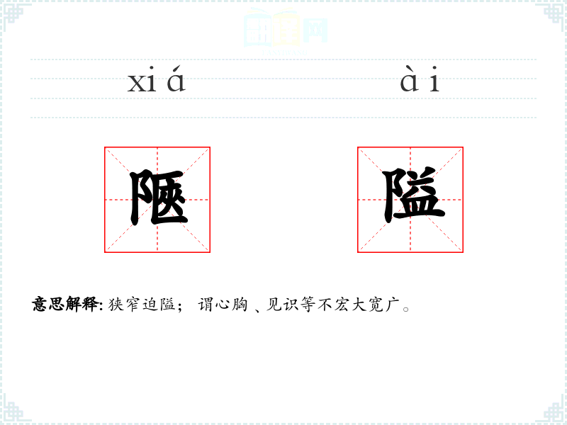 狭窄迫隘; 谓心胸﹑见识等不宏大宽广。