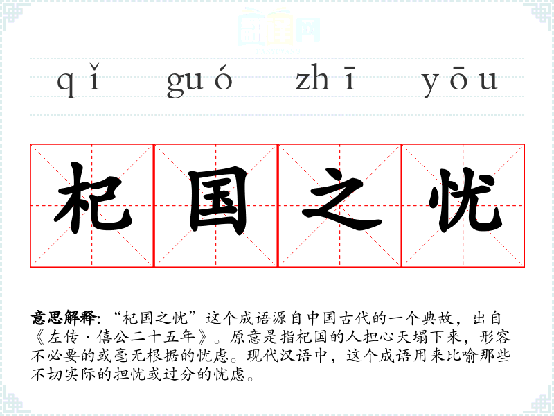 “杞国之忧”源自《左传》,杞国是春秋时期的一个小国,杞人忧天是一个著名的典故。随着时间的推移,这个成语被广泛使用,并逐渐成为表达不必要担忧的固定说法。