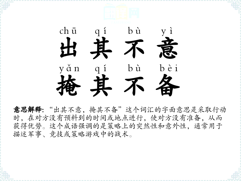 “出其不意,掩其不备”这个词汇的字面意思是采取行动时,在对方没有预料到的时间或地点进行,使对方没有准备,从而获得优势。这个成语强调的是策略上的突然性和意外性,通常用于描述军事、竞技或策略游戏中的战术。