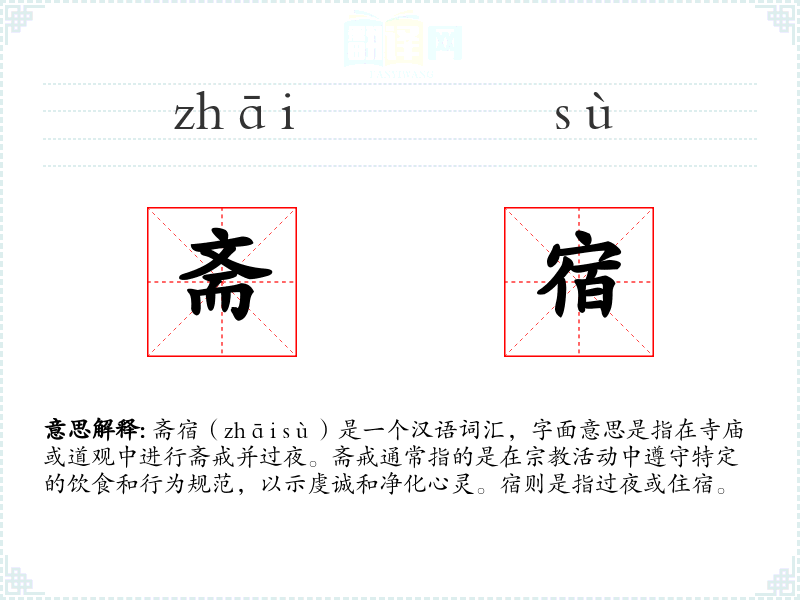 - 他在寺庙中斋宿三日,以净化心灵。