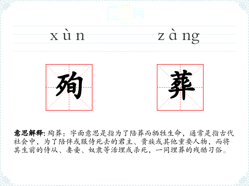 殉葬:字面意思是指为了陪葬而牺牲生命,通常是指古代社会中,为了陪伴或服侍死去的君主、贵族或其他重要人物,而将其生前的侍从、妻妾、奴隶等活埋或杀死,一同埋葬的残酷*俗。