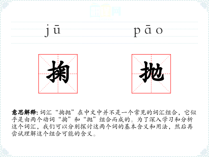 词汇“掬抛”在中文中并不是一个常见的词汇组合,它似乎是由两个动词“掬”和“抛”组合而成的。为了深入学*和分析这个词汇,我们可以分别探讨这两个词的基本含义和用法,然后再尝试理解这个组合可能的含义。