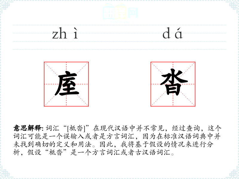词汇“[柢沓]”在现代汉语中并不常见,经过查询,这个词汇可能是一个误输入或者是方言词汇,因为在标准汉语词典中并未找到确切的定义和用法。因此,我将基于假设的情况来进行分析,假设“柢沓”是一个方言词汇或者古汉语词汇。