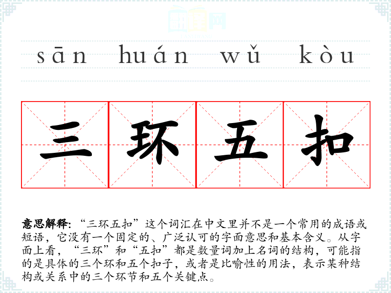 “三环五扣”这个词汇在中文里并不是一个常用的成语或短语,它没有一个固定的、广泛认可的字面意思和基本含义。从字面上看,“三环”和“五扣”都是数量词加上名词的结构,可能指的是具体的三个环和五个扣子,或者是比喻性的用法,表示某种结构或关系中的三个环节和五个关键点。