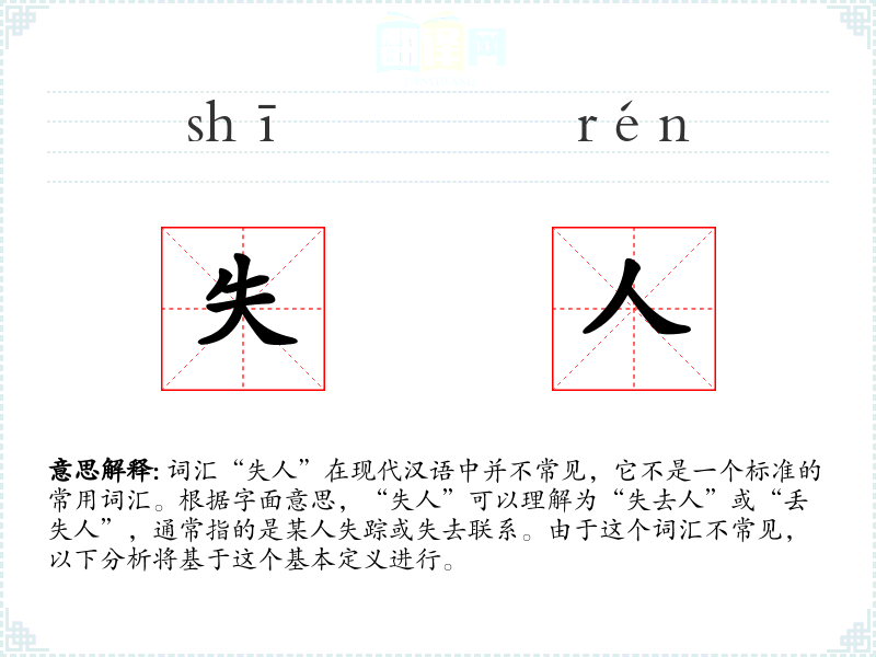 词汇“失人”在现代汉语中并不常见,它不是一个标准的常用词汇。根据字面意思,“失人”可以理解为“失去人”或“丢失人”,通常指的是某人失踪或失去联系。由于这个词汇不常见,以下分析将基于这个基本定义进行。
