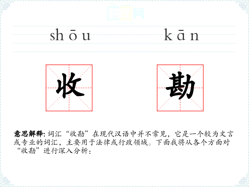 词汇“收勘”在现代汉语中并不常见,它是一个较为文言或专业的词汇,主要用于法律或行政领域。下面我将从各个方面对“收勘”进行深入分析: