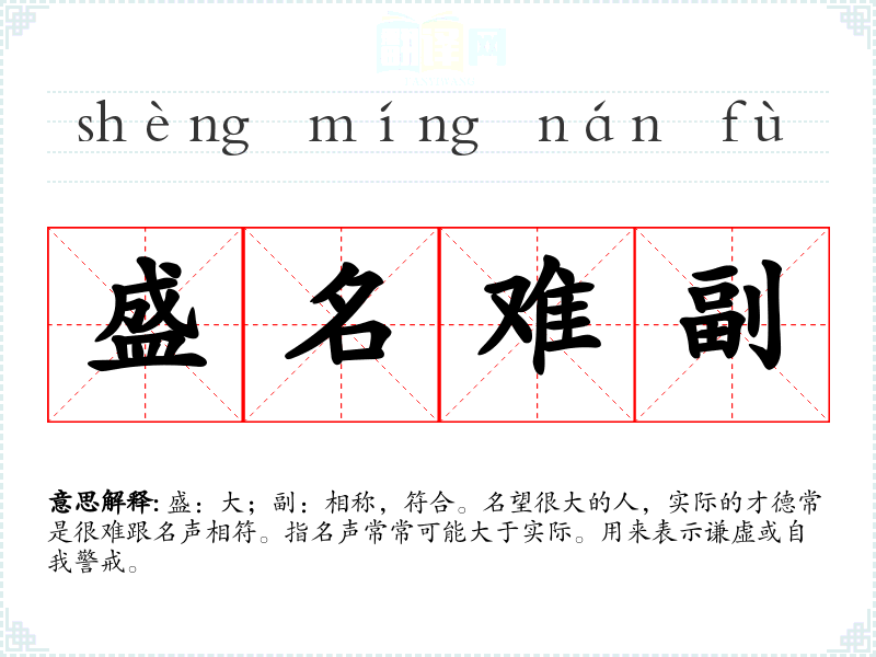 盛:大;副:相称,符合。名望很大的人,实际的才德常是很难跟名声相符。指名声常常可能大于实际。用来表示谦虚或自我警戒。