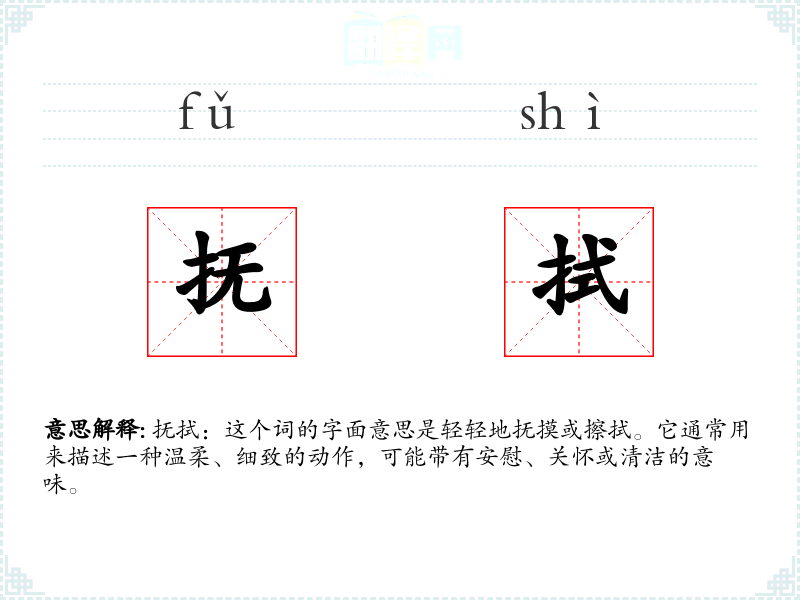 抚拭:这个词的字面意思是轻轻地抚摸或擦拭。它通常用来描述一种温柔、细致的动作,可能带有安慰、关怀或清洁的意味。