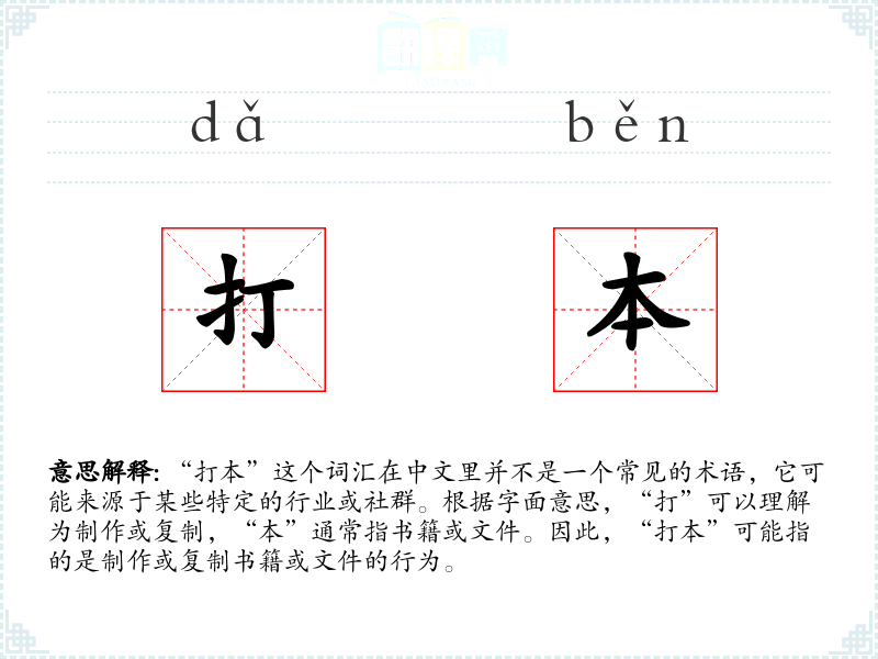 “打本”这个词汇在中文里并不是一个常见的术语,它可能来源于某些特定的行业或社群。根据字面意思,“打”可以理解为制作或复制,“本”通常指书籍或文件。因此,“打本”可能指的是制作或复制书籍或文件的行为。